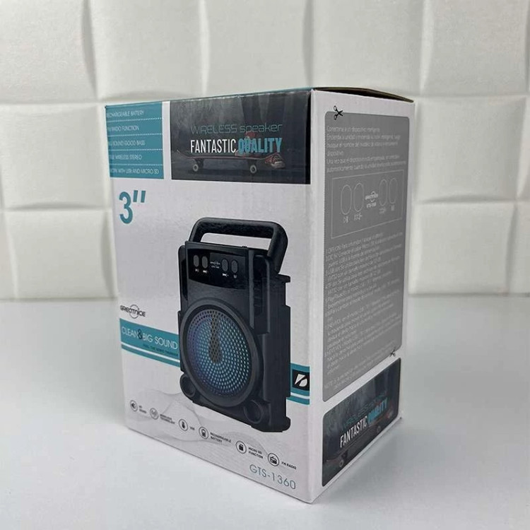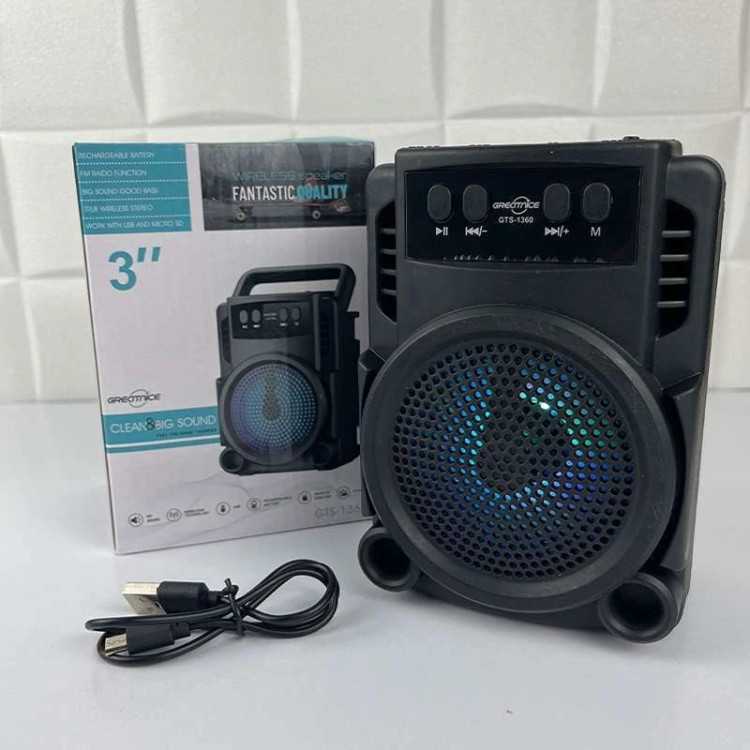 این اسپیکر همه کاره، دارای باتری داخلی قابل شارژ است که میتوانید از کابل micro usb داخل جعبه برای آن استفاده کنید. جنس بدنه اسپیکر بلوتوثی GTS_1360 از پلاستیک فشرده ABS ساخته شده و رقص نور RGB آن در شبنشینیهای شما بر زیبایی و کارایی این محصول میافزاید.