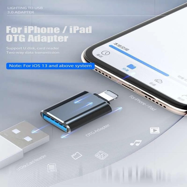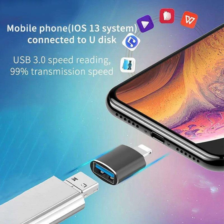 OTG لایتنینگ یک مبدل بدون نیاز به نصب نرم افزار، مخصوص گوشی و تبلت های اپل با سرعت بالاست، از آنجایی که این محصول به تازگی به تولید رسیده و با تکنولوژی روز هماهنگ است میبایست ورژن IOS دستگاه از 13 بالاتر باشد. جنس بدنه این OTG الومینیومی و سخت است، بدون نصب هیچ گونه نرم افزاری با سرعت بسیار بالایی کار میکند و کارکردن با آن بسیار ساده است، حداکثر توان خروجی این مبدل 200 میلی آمپر و سرعت انتقال داده آن به لطف تکنولوژی USB 3.0 به عدد واقعی 625MB/s میرسد. همچنین با داشتن این OTG میتوانید دستگاه هایی مانند فلش مموری، هارد اکسترنال، هاب یو اس بی، موس، کیبورد، دسته بازی و دوربین عکاسی را به موبایلتان متصل کنید و حتی از دستگاه های دیگر که قابلیت شارژ کردن دارند(مانند: موبایل ها و یا اسپیکر هایی که قابلیت پاوربانک دارند) برای شارژ کردن موبایلتان استفاده کنید، هچنین دیگر نیازی نیست حافظه دوربین را خارج کنید! میتوانید با اتصال مستقیم مبدل به دوربین از طریق کابل تمامی عکس های ذخیره شده را در موبایلتان نگاه کنید، حذف کنید و یا به حافظه گوشی منتقل کنید و یا تصاویر و فیلم های گرفته شده با موبایل خود را به فلش یا هارد اکسترنال منتقل نمایید.
