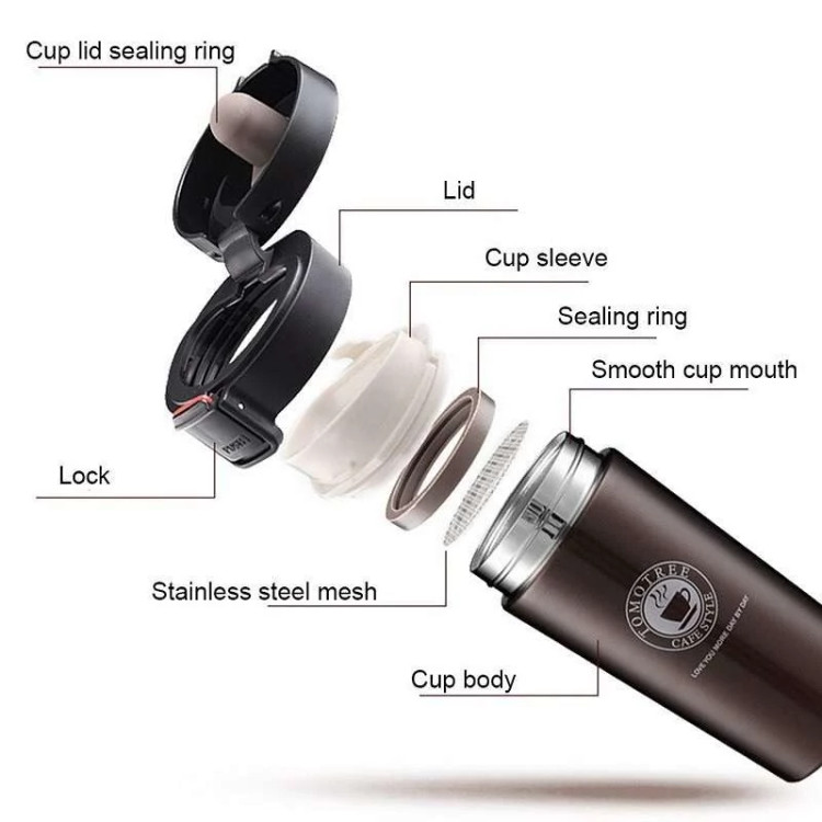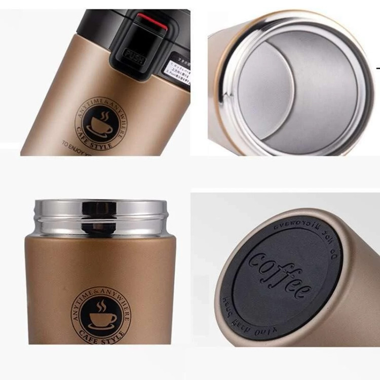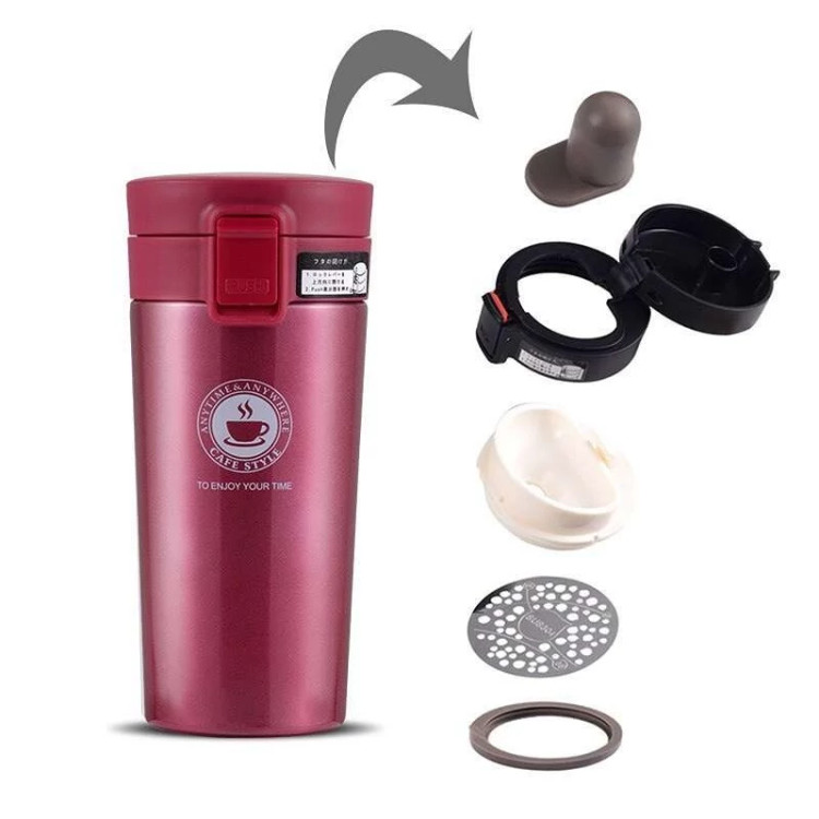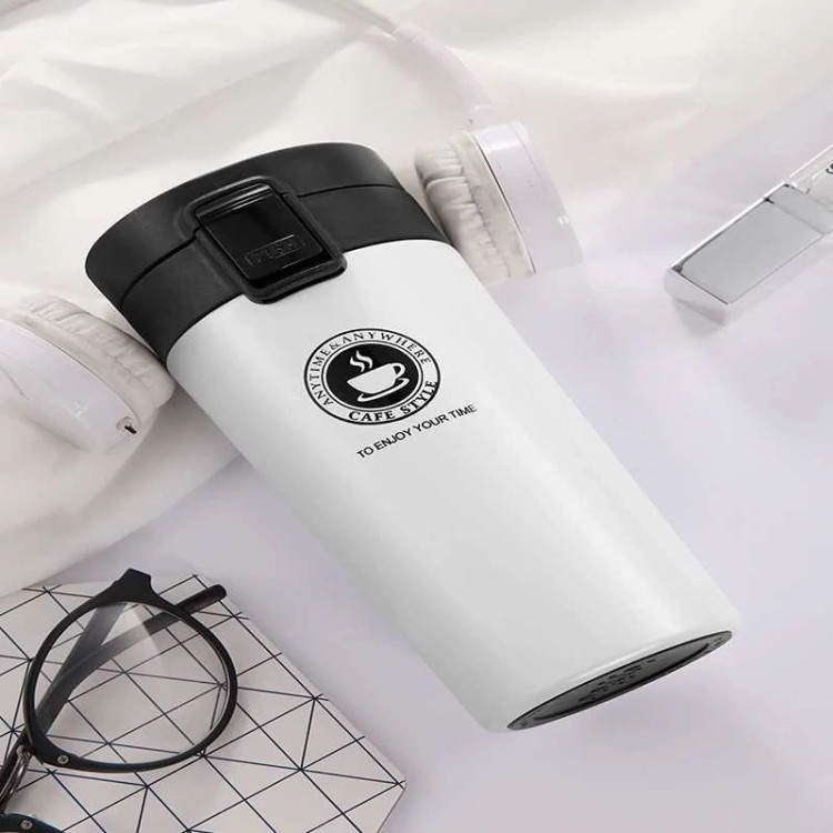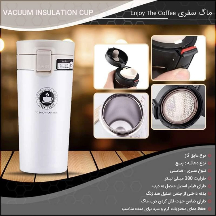 امروزه ماگهای دو جداره در طرح ها و سایزهای مختلف به وفور یافت می شوند.این ماگها چه در منزل یا محیط کار و چه به هنگام سفر به کار می آیند. ماگ سفری مدل Enjoy The Coffee دیواره ای دو جداره دارد که از جنس استیل ضد زنگ ساخته شده و برای نگهداری طولانی مدت دمای نوشیدنی های گرم و سرد قابل استفاده است.درپوش این ماگ به صورت پیچی بسته می شود و از ریزش و نشت مایعات کاملا جلوگیری بعمل می آورد. باز شدن درب این لیوان تنها با یک فشار تماسی انجام میگیرد. این طراحی هوشمندانه به شما این امکان را میدهد که از همه محیط پیرامون لبه لیوان در یک فضای 360 درجه نوشیدنی خود را بنوشید.این موضوع باعث می شود که به هنگام عدم استفاده از تغییر دما و یا ریخته شدن مایعات درون ماگ جلوگیری بعمل آید.ارتفاع آن 17.5 سانتی متر است لذا مناسب قرارگیری در نگه دارنده های لیوان اکثرخودروها می باشد.حجم این ماگ 380 میلی لیتر است که حجم مناسبی میباشد.