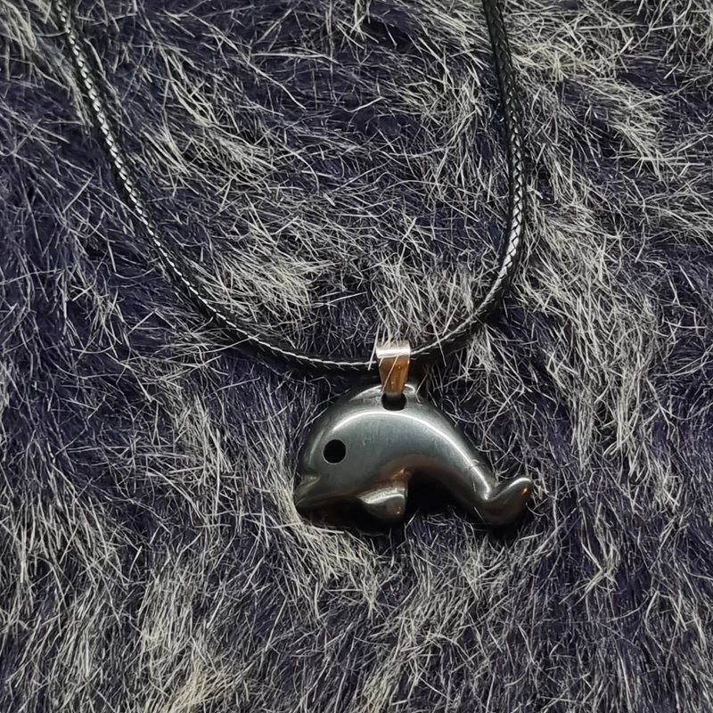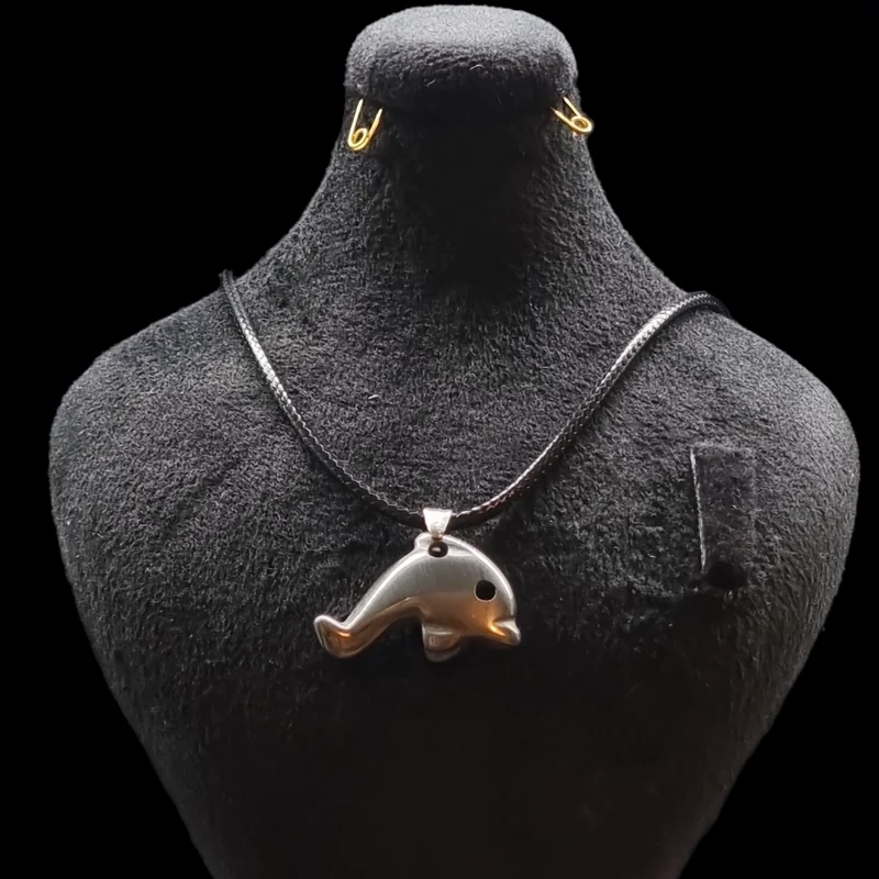 گردنبند سنگ حدید معدنی با طرح دلفین تراش هنر دست می باشد .سنگ حدید نوعی کریستال مات است که به رنگ های سیاه، سیاه مایل به خاکستری و قهوه ای مایل به قرمز موجود می باشد. این سنگ از اکسید آهن سیاه و فلزی شکل، تشکیل می شود که با منیتیت (سنگ آهن مغناطیسی) و اکسید آهن مغناطیسی متفاوت است.برای سنگ حدید خواص فراوانی بیان شده که مهمترین این خواص به شرح زیر است:* تقویت قلب* تنظیم گردش خون* درمان فشار خون* تصفیه خون* تحریک جذب آهن توسط خون و درمان کمخونی* تسکین دردهای آرتروز و انقباضات ماهیچهای* ایجاد تعادل و تنظیم چاکرای اول* ایجاد قدرت، استقامت و نشاط* تقویت تمرکز و حافظه* ممانعت از جذب امواج منفی دیگران می باشد.سنگ حدید سنگ حدید هم یکی دیگر از سنگهای ماه تولد شهریور است که برای متولدین این ماه بسیار مناسب بوده و خواص جالب و بسیار فوق العادهای دارد. وزن9گرم 3سانت در1سانت می باشد.