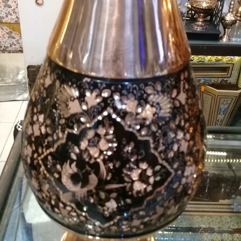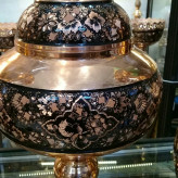 ساخته شده از مس.رنگ کوره ای مشکی و حکاکی شده با قلم مخصوص حکاکی اثر دست.دارای روکش پلی استر جهت ثابت ماندن رنگ مس.