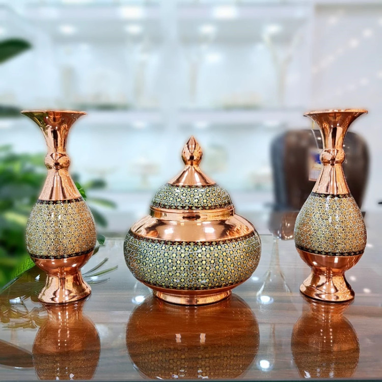 ست سه تیکه گلدان و شکلات خوری مس و خاتم اعلاء (خرید مستقیم و بدون واسطه از تولیدی)