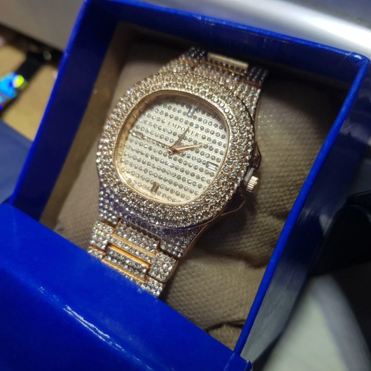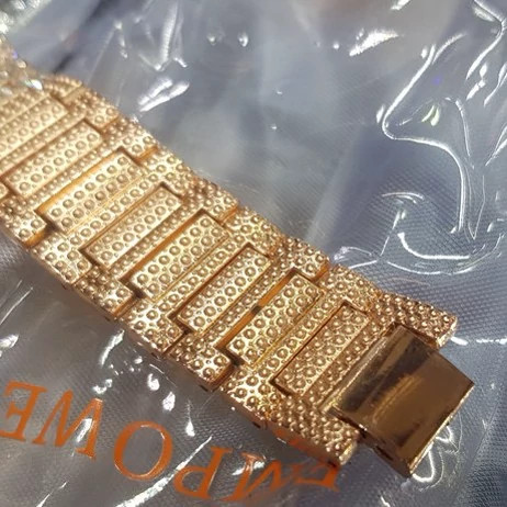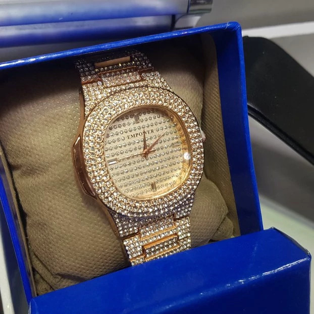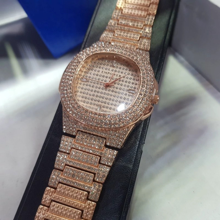صفحه داخلی ساعت و دور قاب ساعت و بخشی از بند ساعت که روی مچ دست قرار میگیرد با نگین های برلیان گونه شفاف و براق مرصعکاری شده است.