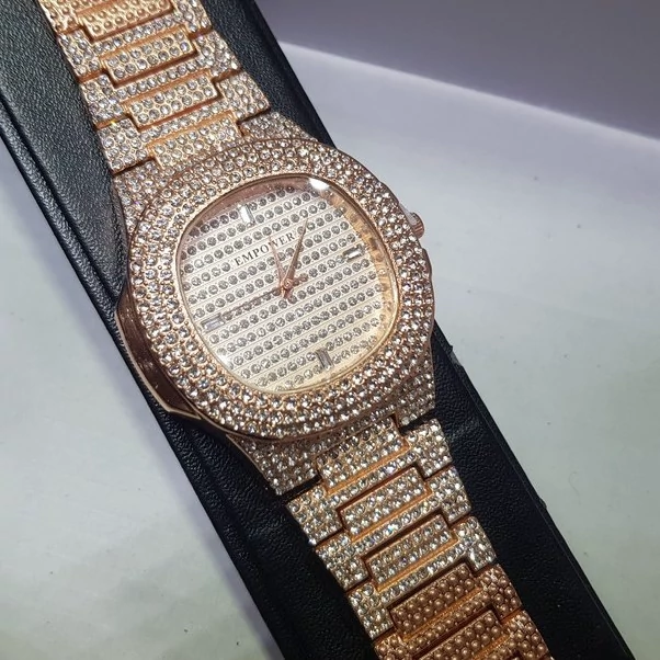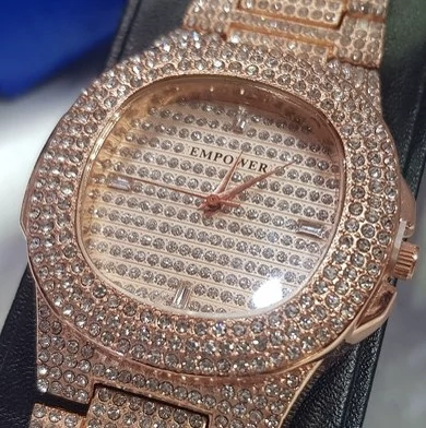 صفحه داخلی ساعت و دور قاب ساعت و بخشی از بند ساعت که روی مچ دست قرار میگیرد با نگین های برلیان گونه شفاف و براق مرصعکاری شده است.