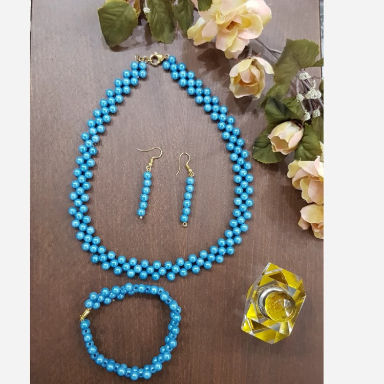 ست گردنبند گوشواره و دستبند بدلیجات طرح مروارید آبی رویال