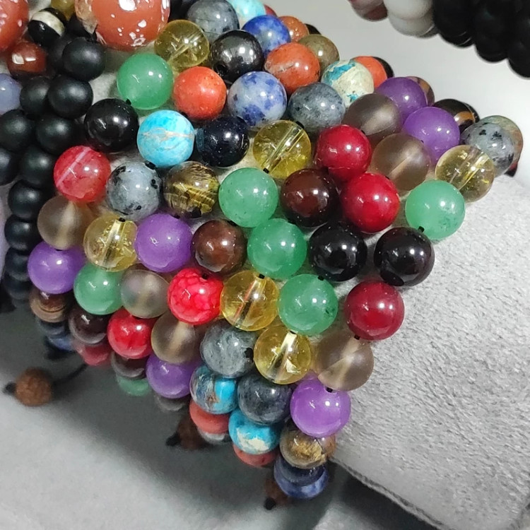 دستبند هفت سنگ مدل مرجان اونتورین یا شاه مقصود چشم ببر حدید و عقیق دراگون اونکیت سودالیت فیروزه لاجورد دلربا امیتیست مون استون لابرادوریت لاوا رودراکشا