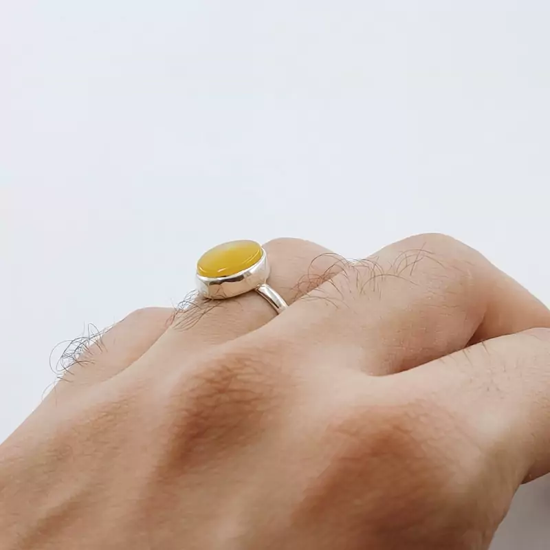 انگشتر نقره مردانه و زنانه نگین عقیق شرف الشمس یا عقیق زرد دارای حرز امام جواد روی پوست آهو و تربت کربلا