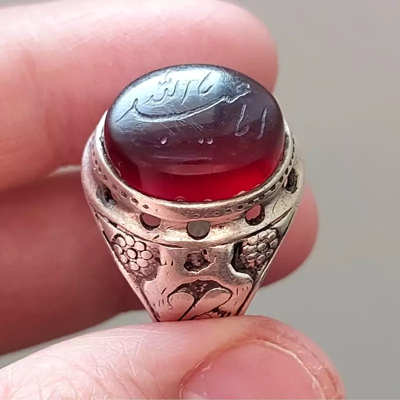 انگشتر عقیق خراسان خونی کهنه حکاکی شده به ذکر یا اباعبدالله با رکاب دست ساز مدل مرغی بسیار کهنه و بکر نقره 925