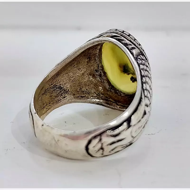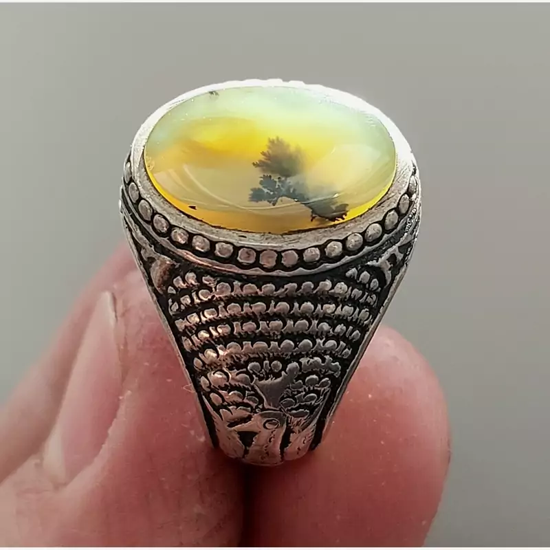 انگشتر شجر قائنات زرد طبیعی بسیار زیبا و کلکسیونی با رکاب نیمه دست ساز مدل قلمکاری مرغی نقره 925