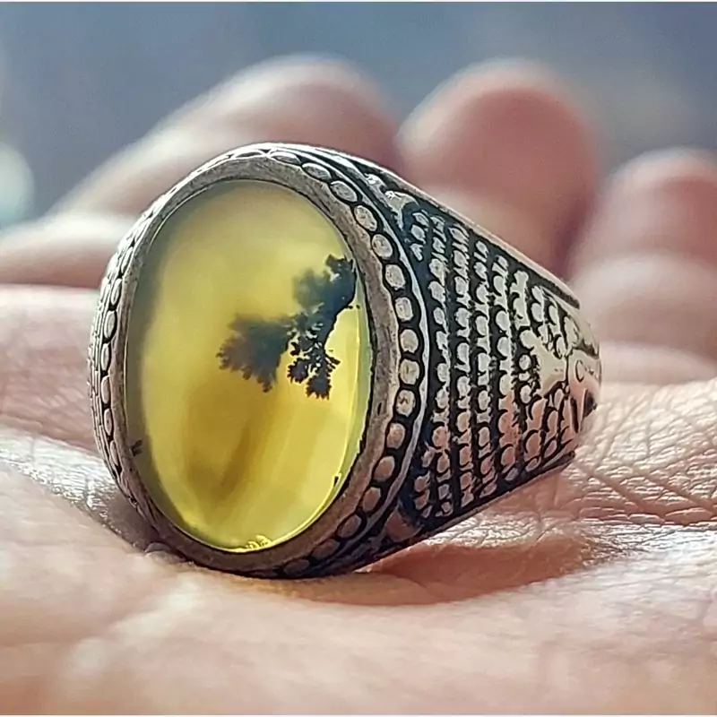 انگشتر شجر قائنات زرد طبیعی بسیار زیبا و کلکسیونی با رکاب نیمه دست ساز مدل قلمکاری مرغی نقره 925
