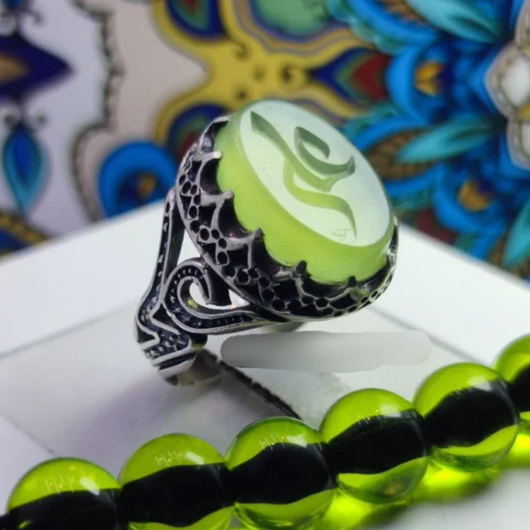انگشتر نقره مردانه عقیق سبز منقش به علی -