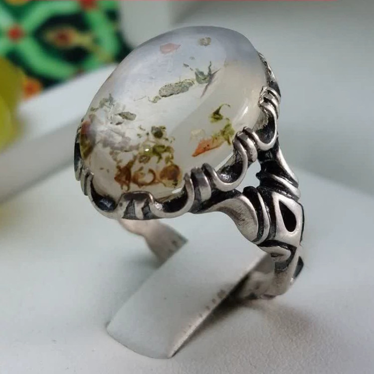 انگشتر نقره مردانه با نگین عقیق شجر رگه دار