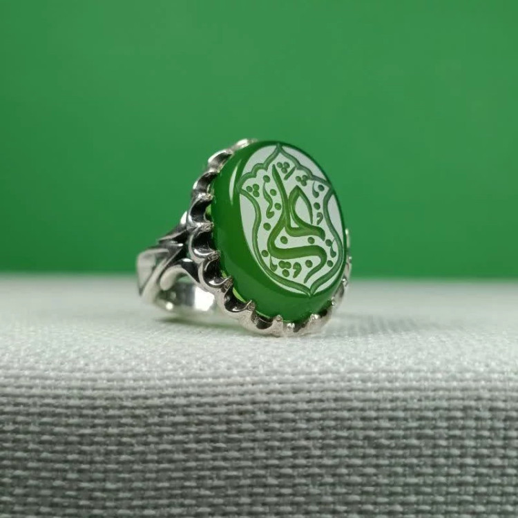 انگشتر نقره مردانه عقیق سبز منقش به ذکر علی