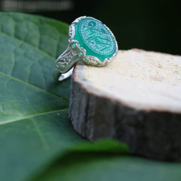 انگشتر نقره زنانه عقیق سبز منقش به یا فاطمه زهرا -،