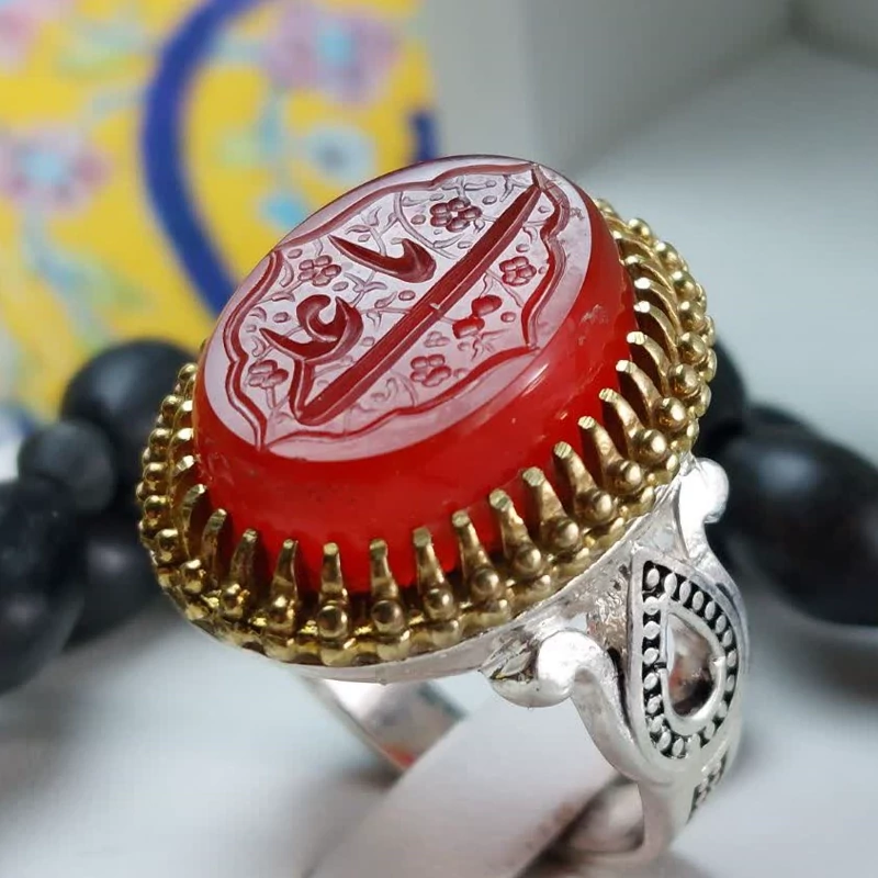 -انگشتر نقره مردانه عقیق سرخ منقش به یا علی -