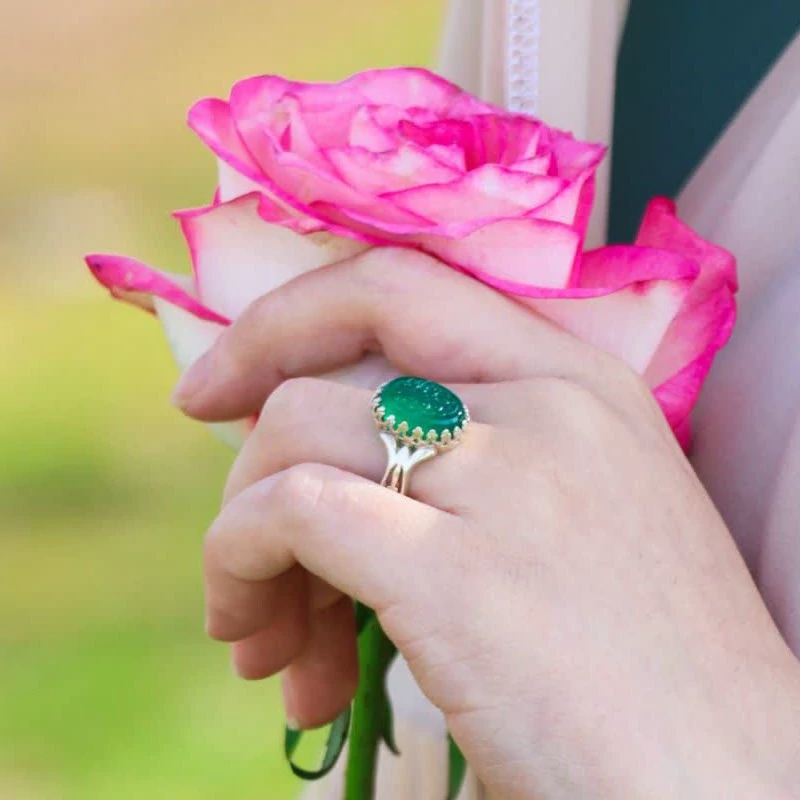 انگشتر نقره زنانه عقیق سبز منقش به یا زهرا --