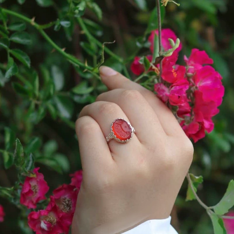 انگشتر نقره زنانه عقیق سرخ منقش به یا فاطمه زهرا --