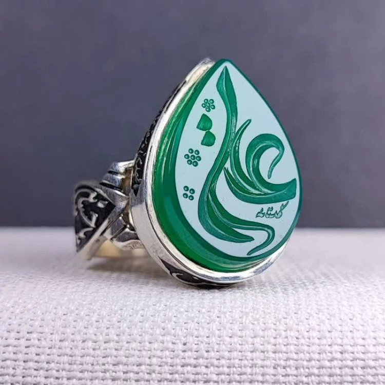 انگشتر نقره مردانه عقیق سبز منقش به علی -