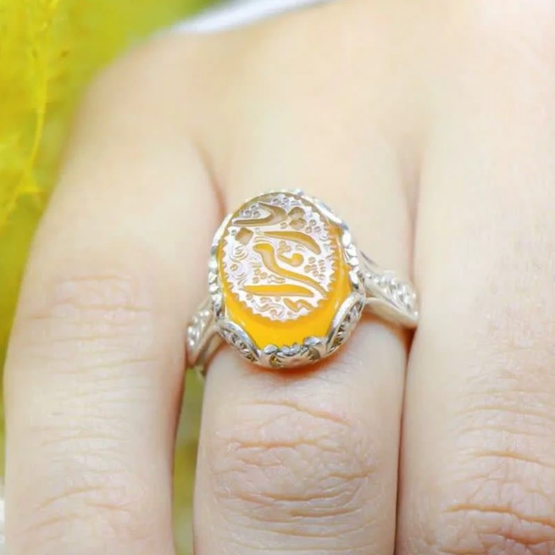 انگشتر نقره زنانه زیبا عقیق زرد منقش به ذکر یا زهرا -