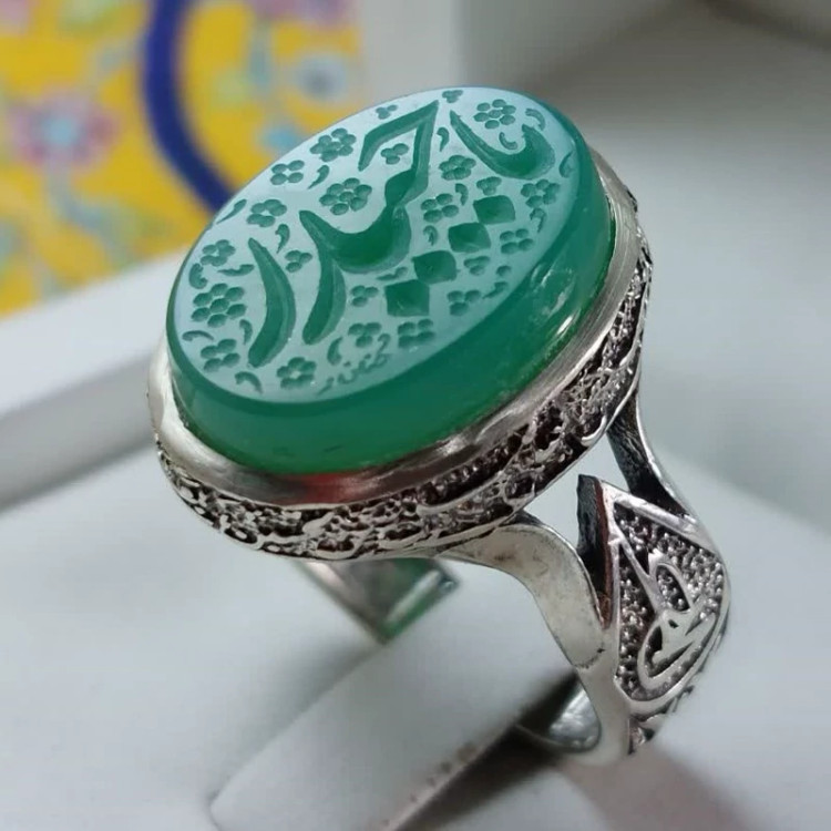 انگشتر نقره مردانه عقیق سبز منقش به یا حیدر -،.