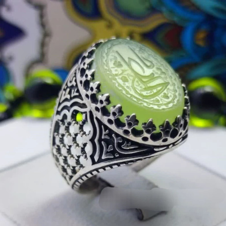 انگشتر نقره مردانه عقیق سبز منقش به ذکر یا علی.