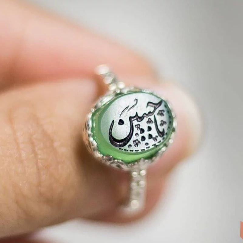 انگشتر نقره زنانه عقیق سبز کاهویی منقش به یا حسین -