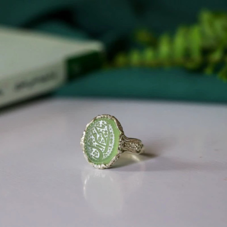 انگشتر نقره زنانه عقیق سبز منقش به یا کریم احل بیت -