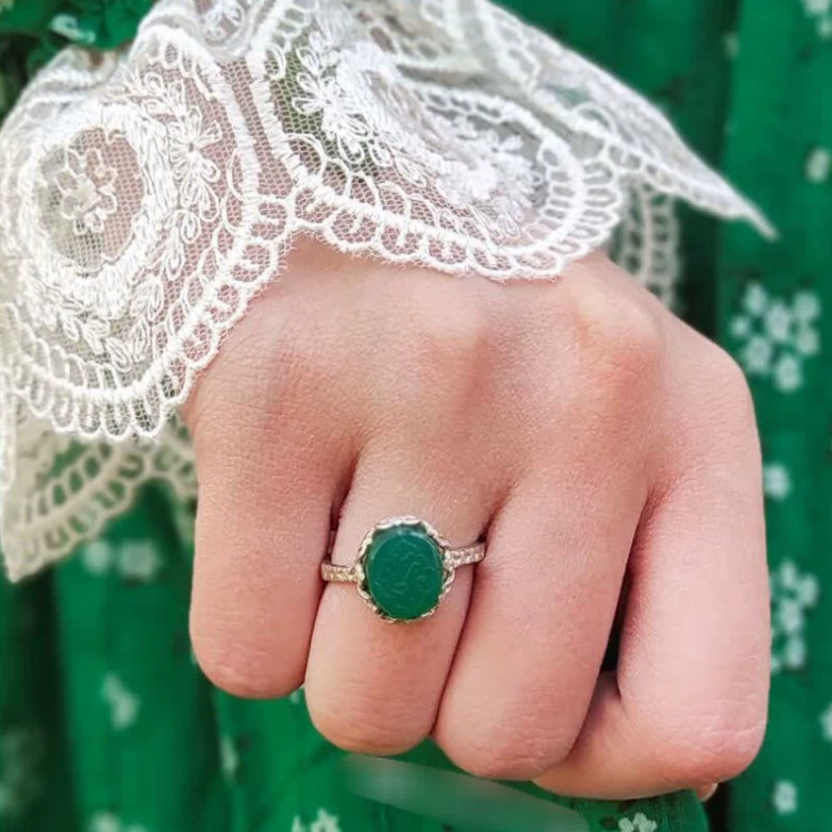 انگشتر نقره زنانه عقیق سبز منقش به یا زهرا-