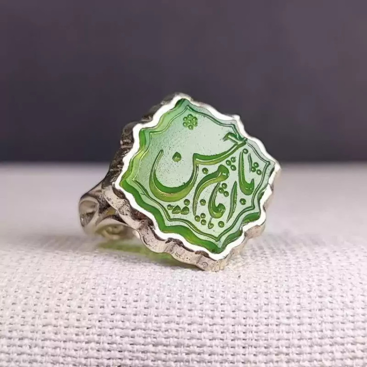 انگشتر نقره مردانه عقیق سبز منقش به امام حسین -،
