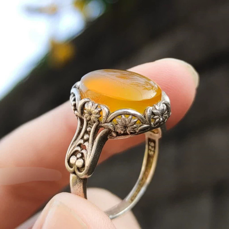 انگشتر نقره زنانه با نگین عقیق زرد و رکابی زیبا --،