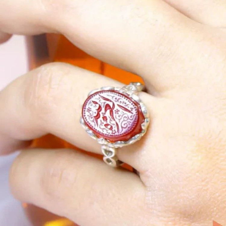انگشتر نقره زنانه عقیق سرخ منقش به العزه الله-