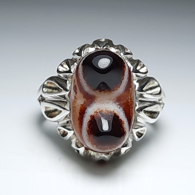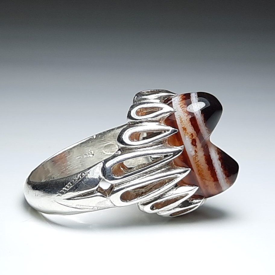 مشاهده محصولات مرتبط💎 انگشتر نقره سفارشی ساز باباقوری دوکوهان ( عقیق سه پوست با تراش دوکوهانه ) خوشرنگ اصل معدنی ، طوقهای منظم و موازی و تنوع رنگی خاص با تراش دقیق و منظم و رکاب نیمه دستساز عیار استاندارد 925 طرح اشکی هنر دست استاد امیر محمدی با مهر عیار و سازنده " امیر " حک شده روی رکاب