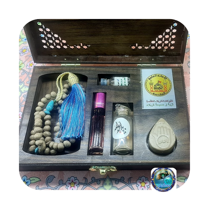 بسته فرهنگی سوغات کربلا جدید (5 قطعه ) عطر کربلا تربت امام حسین تسبیح مهر تربت و آب سرداب حرم حضرت عباس