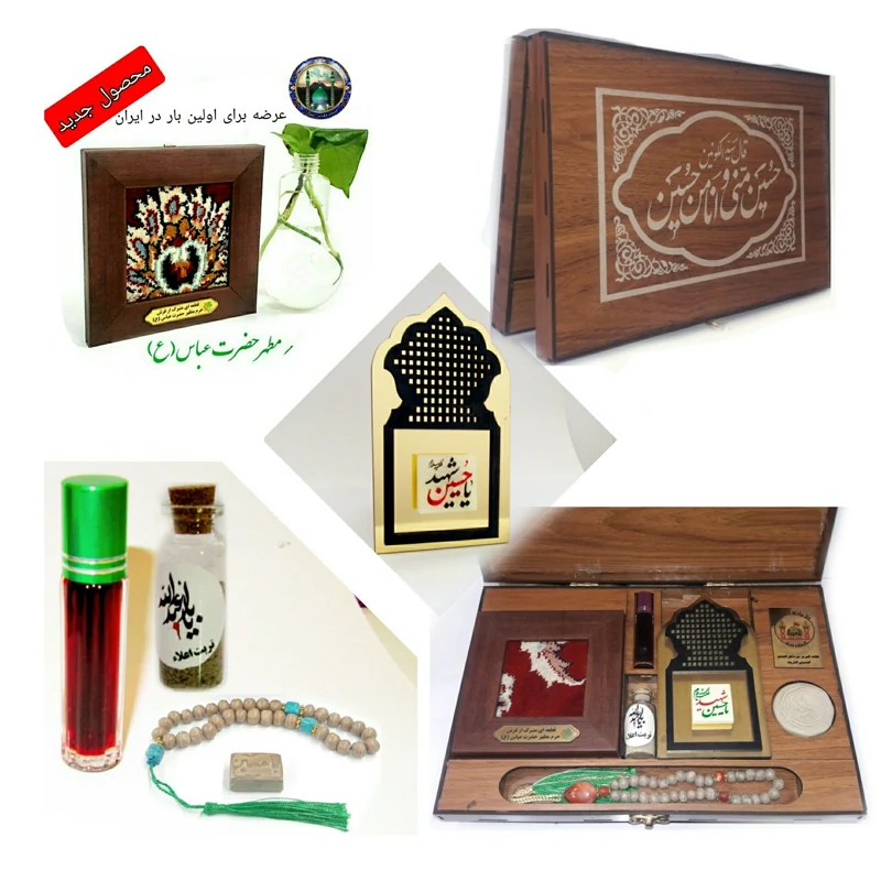 بسته فرهنگی سوغات کربلا 7 قطعه سنگ حرم امام حسین قاب فرش حرم حضرت عباس تسبیح عطر وآب سرداب حرم حضرت عباس