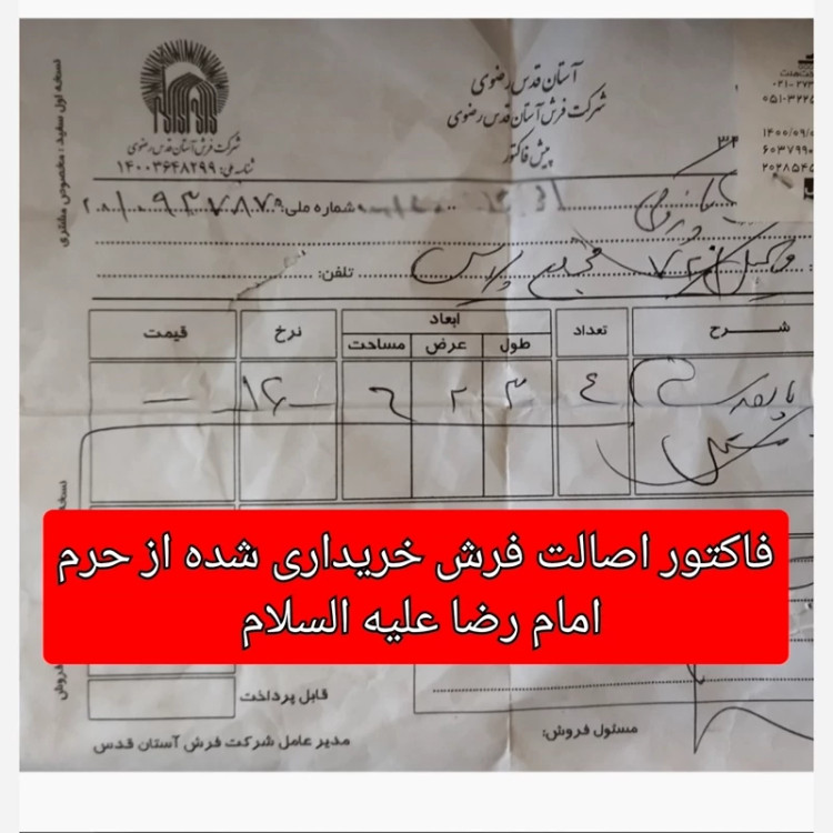 سجاده فرش حرم امام رضا ( با سند اصالت فرش) ( وهدیه همراه بسته یک مهر کوچک مخلوط کربلا و تسبیح پلاستیکی ارسال میشود)
