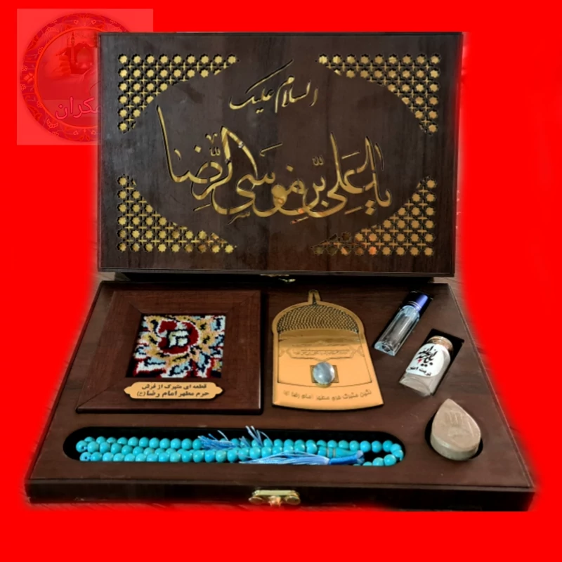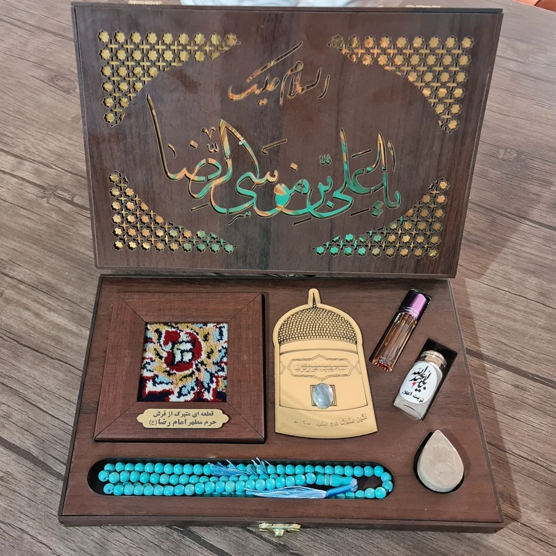 بسته فرهنگی سوغات مشهد 6 قطعه نگین سنگ وقاب فرش وعطرحرم امام رضا و تسبیح فیروزه و مهر وتربت امام حسین بافاکتوراصالت کالا
