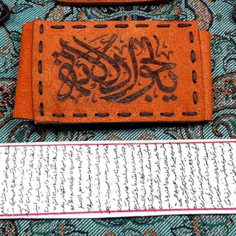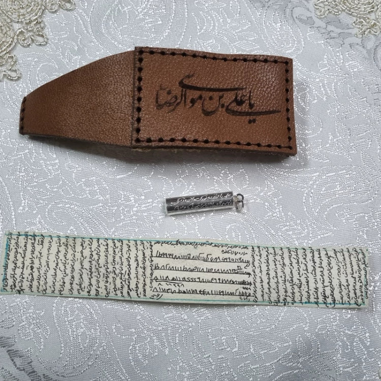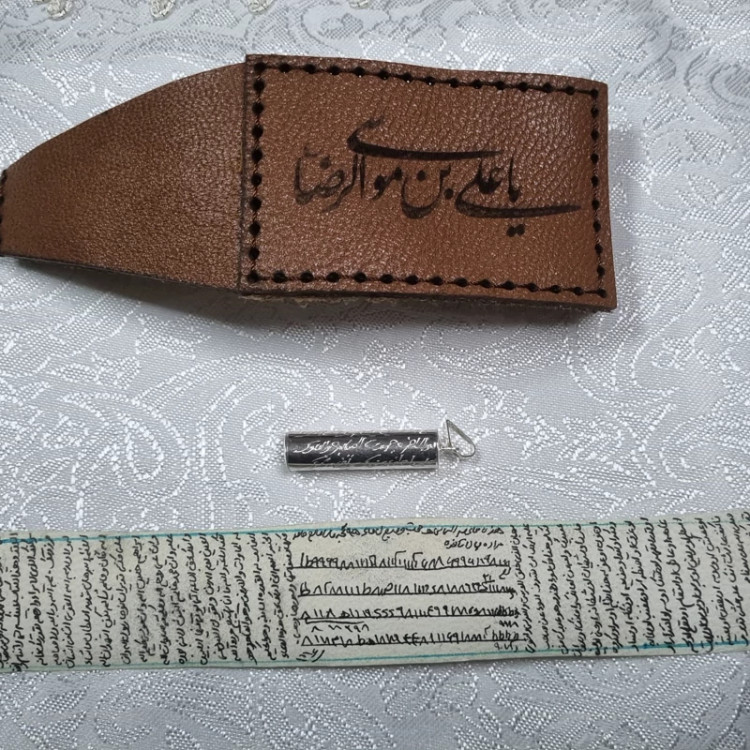 حرز امام جواد علیه السلام بازوبند چرم و لول نقره (دست نویس روی پوست آهو) با آداب