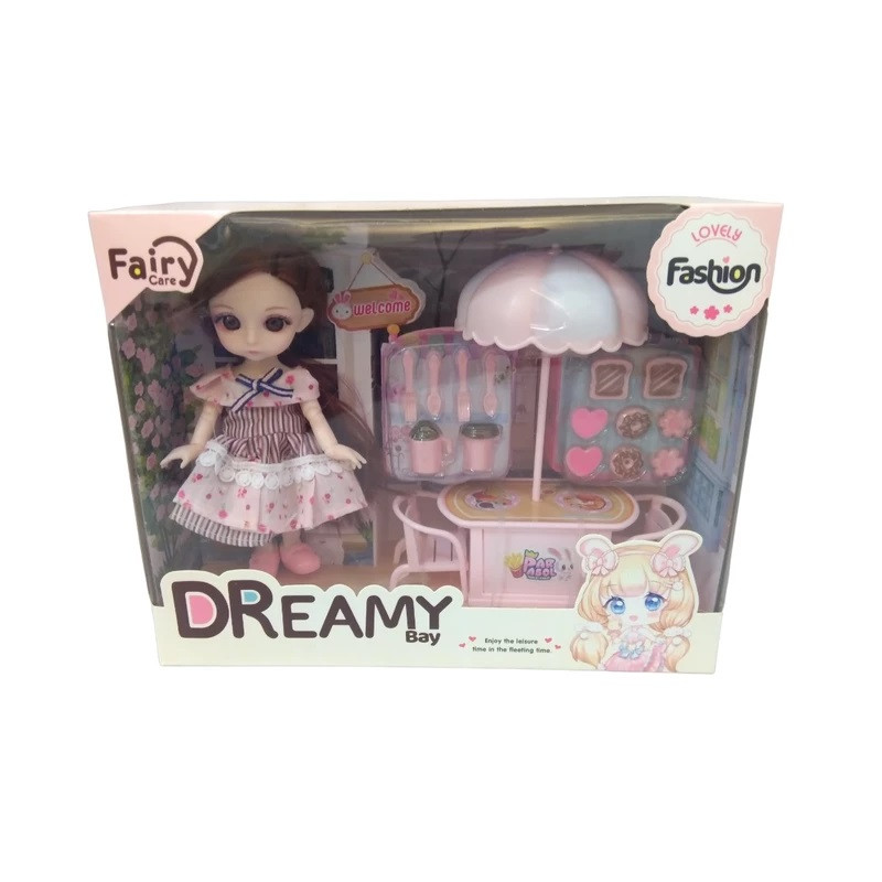 اقلام همراهمیز به همراه چتر ، 2 عدد صندلی ، 8 عدد شیرینی ، دو عدد ماگ ، 4 عدد قاشق و چنگال ، عروسک دختر شیرینی فروش