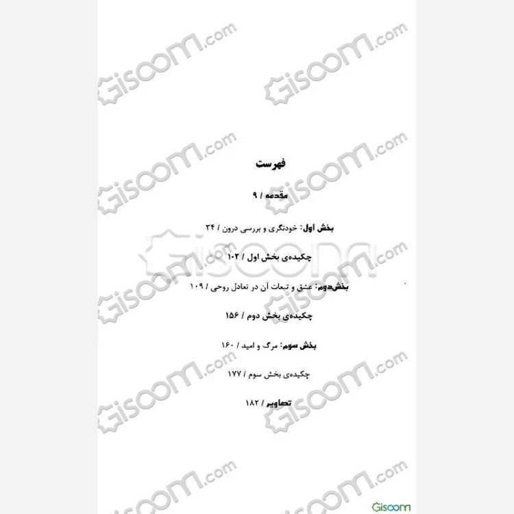 کتاب حاضر، در سه بخش به موضوع رنگ درمانی و تأثیر رنگ در ابعاد مختلف زندگی اختصاص دارد. نگارنده در بخش اوّل کتاب، بازنگری درون را با استفاده از رنگ توضیح داده و چگونگی ایجاد تعادل و هماهنگی را در زندگی و درون انسان شرح داده است. در بخش دوم، عشق و تبعات آن در تعادل روحی و نگرش مثبت رنگدرمانی به مهرورزی به عنوان سرچشمة فضایل اخلاقی بیان شده است. در بخش سوم کتاب، مرگ و امید و ارتباط آن با رنگ درمانی تشریح شده و در قسمت پایانی نیز، دلنوشتة نویسنده به همراه تصاویری از رنگهای متفاوت گنجانده شده است.