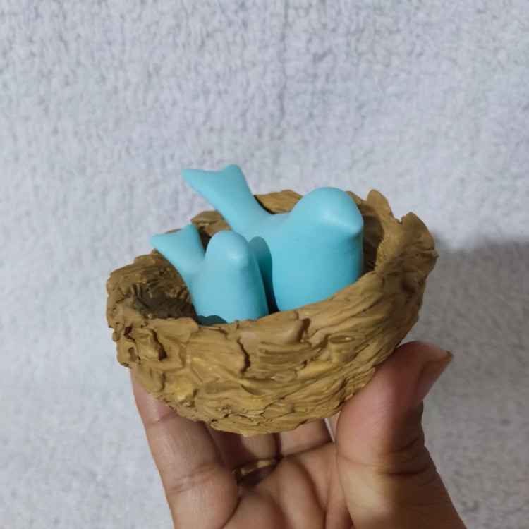 دکوری لونه پرنده به همراه 2 پرنده متوسط و کوچک رنگ شده ، لانه پرنده و لونه رنگی جنس سنگ مصنوعی ، مجسمه گنجشک ،پرنده رنگی