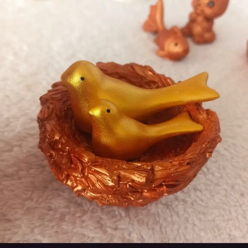 دکوری لونه پرنده به همراه 2 پرنده متوسط و کوچک رنگ شده ، لانه پرنده و لونه رنگی جنس سنگ مصنوعی ، مجسمه گنجشک ،پرنده رنگی
