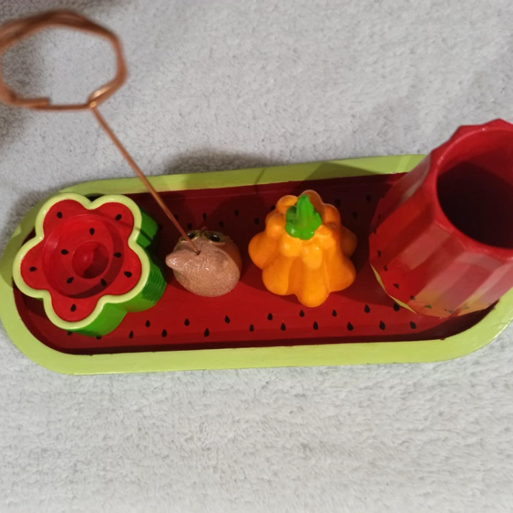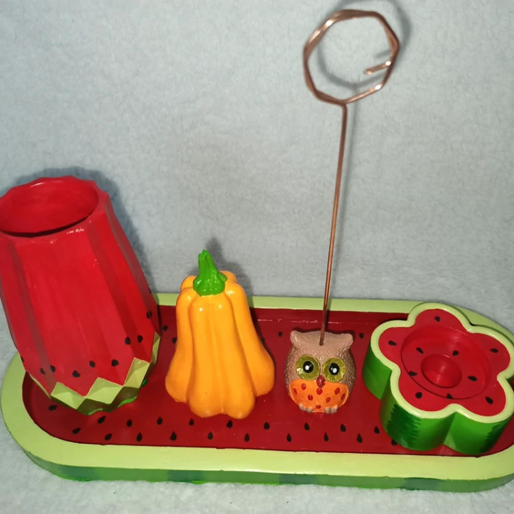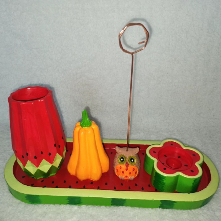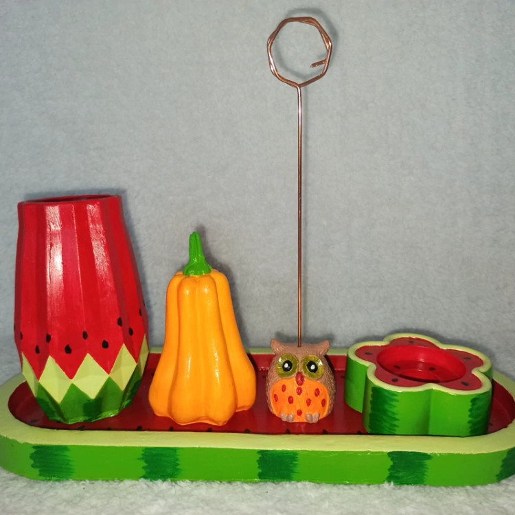 سینی یلدایی ، سینی اکسسوری یلدا ، سینی دکوراتیو طرح هندونه یلدا ، سینی دکوری شامل گلدان لوتوس بلند ، شمعدون ، کدو و جغد