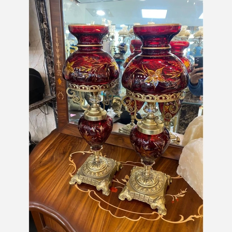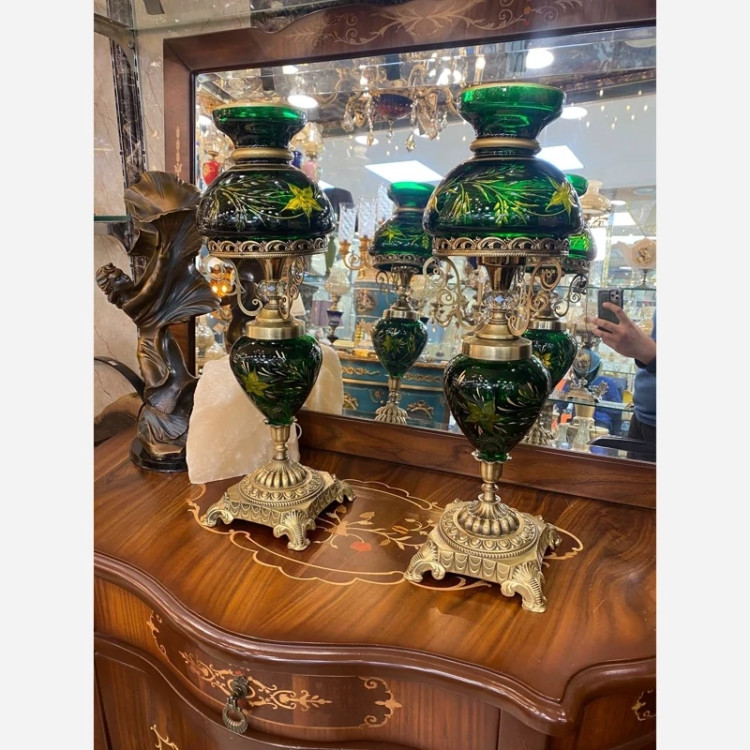 آباژور رومیزی لمپا لنتر چراغ نفتی رومیزی تراش دار پایه برنز قالپاقی سبز محرمات شمعدان