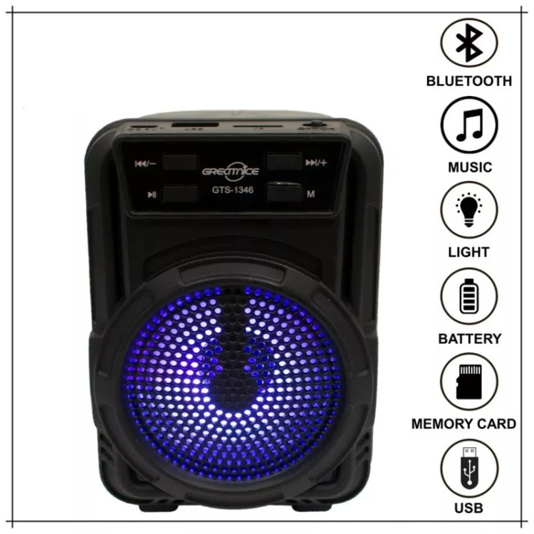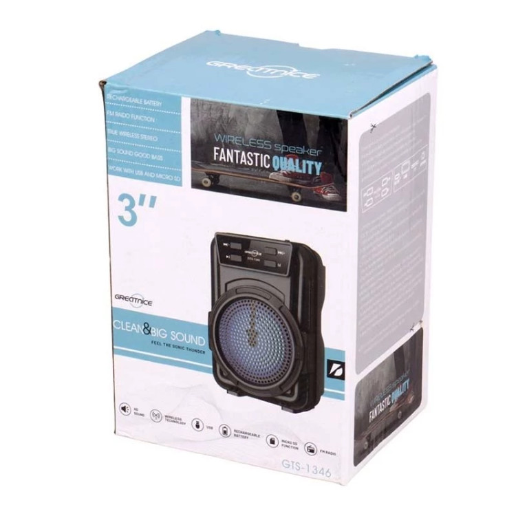 اسپیکر بلوتوثی قابل حمل مدل GTS-1346 اسپیکر پرتابل GTS-1346 را می توان به شکل ایستاده به کار برد و علاوه بر بلوتوث، با کارت حافظه، فلش مموری سازگاری دارد و همچنین و جود یک ساب 3 اینچی باعث شده است تا بتوانید ازقدرت صدای شگفت انگیزبهره ببرید.اسپیکر بلوتوث مدل GTS-1346 سری FANTASTIC با کیفت عالی و ورودی TF،USB که صدایی با کیفیت در اختیار کاربر قرار می دهد. رقص نور ویژگی شگفت انگیز دیگر این اسپیکر، وجود رقص نوررنگی در هنگام پخش موزیک است.که باعث زیبا تر شدن فضا میشود و لذت گوش دادن به موسیقی را چند برابر میکند - قابلیت ویژه دیگر اسپیکر GTS-1346وجود فناوری TWS یا همان اتصال همزمان دو دستگاه با مدل یکسان برای قدرت صدای بیشتر می باشد.