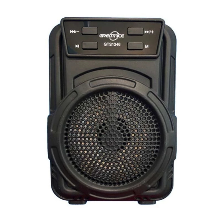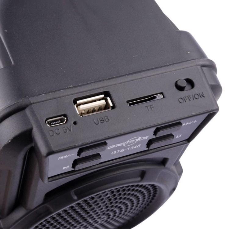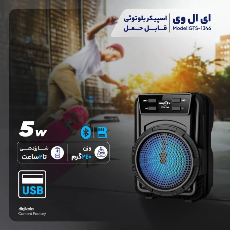 نحوه ی اتصال به صورت بی سیم توسط بلوتوث با محدوده ی عملکرد 10 متر بدون مانع ، با پشتیبانی از فلش مموری (USB) و رم میکرو SD جهت پخش موسیقی - حداکثر حجم حافظه قابل پشتیبانی 32 گیگابایت، پاسخ فرکانسی در محدوده ی 100 هرتز الی 20 کیلوهرتز به منظور پوشش صداهای زیر و بم - باتری درایورهای داخلی این بلندگو بی سیم، قدرتی برابر 10 وات برای آن رقم می زنند و با هر بار شارژ کامل باتری 800 میلی آمپر ساعتی آن امکان 2 ساعت پخش مداوم موزیک با ولوم 50% در اختیارتان خواهد بود. - رادیو از ویژگی های دیگر اسپیکر وایرلس جی تی اس مدل GTS-1346می توان به رادیوی FM، برد 10 متری و پخش صدای استریو اشاره کرد. - جنس بدنه از پلاستیک با کیفیت، دارای دسته جهت حمل آسان و مناسب - دارای کلیدهای فیزیکی جهت روشن و خاموش کردن، مدیریت موسیقی و امکان شارژ مجدد دستگاه توسط پورت MicroUSB و کابل همراه
