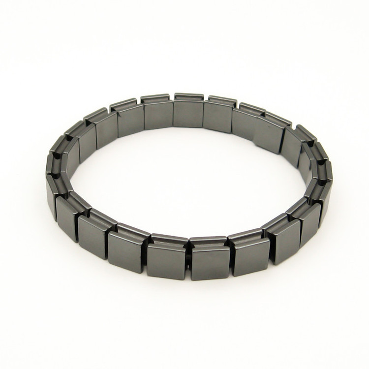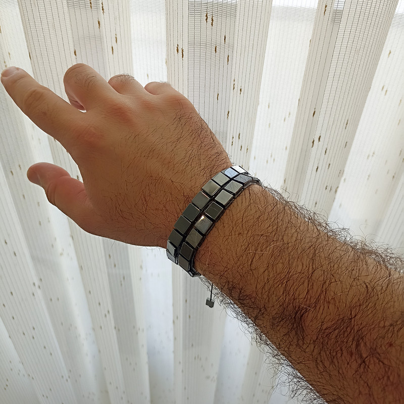 جزئیات: مهره های طبیعی سنگ حدید (هماتیت) به رنگ نوک مدادی به ابعاد حدوی 0.8 در 0.8 سانتی متر / بافت مهرهها توسط بند مشکی بسیار محکم به یکدیگر /