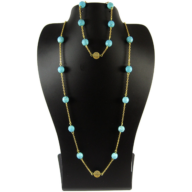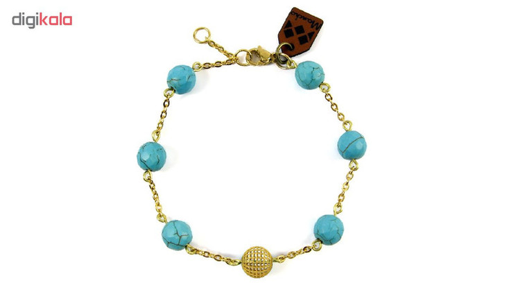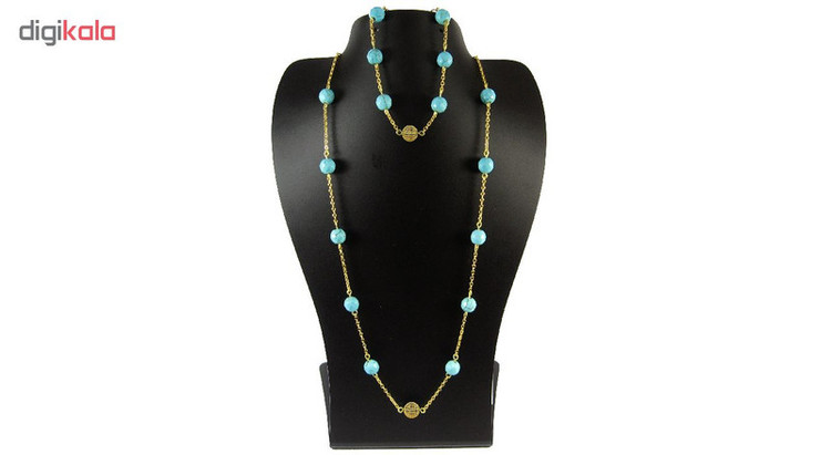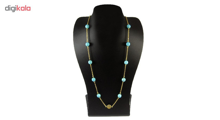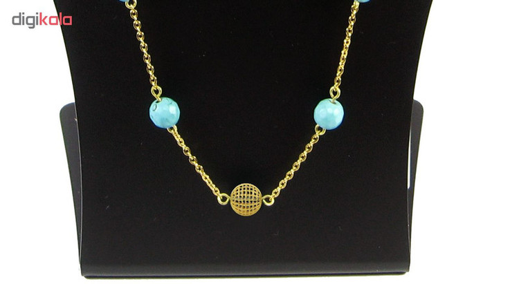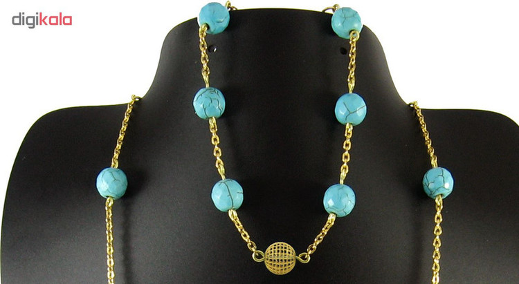 ساخته شده از : یک گوی طلا 18 عیار توری شکل به ابعاد 0.8 در 0.8 مهره های طبیعی فیروزه تراش خورده به قطر 0.8 سانتی متر که توسط زنجیر و قفل استیل با آبکاری طلایی بسیار محکم و ظریف به هم متصل شده اند با طول حدودی 50 تا 55 سانتی متر