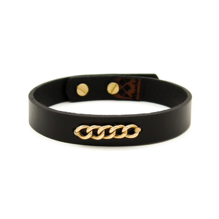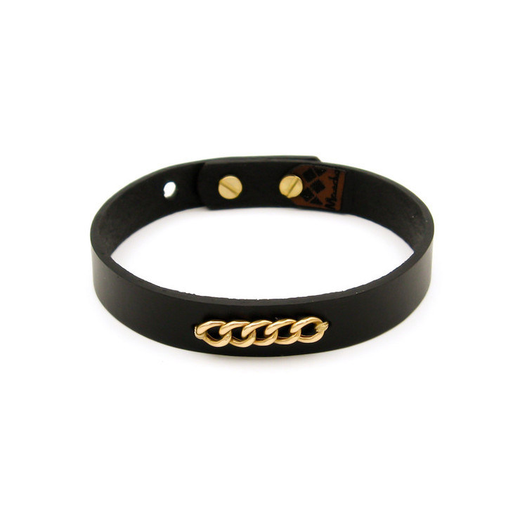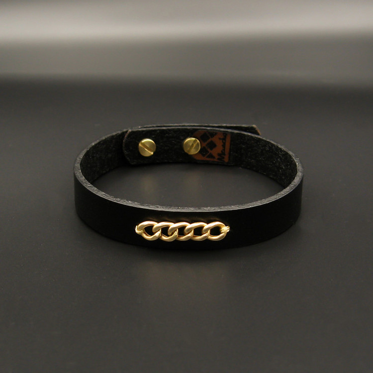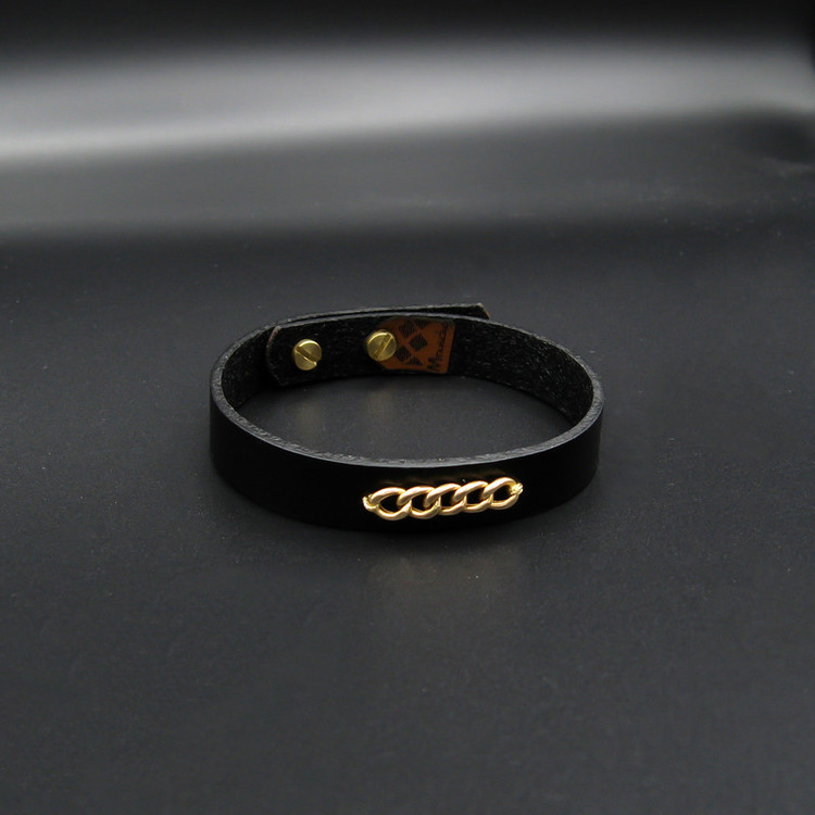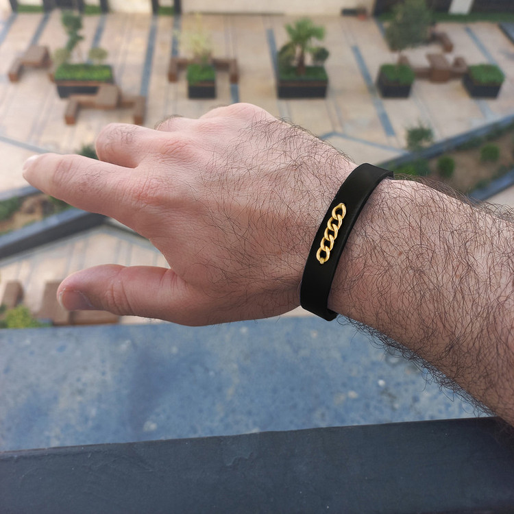 دستبند چرم و طلا، متشکل از چرم طبیعی به رنگ مشکی و پلاک طلای 18 عیار طرح زنجیر کارتیر ابعاد پلاک طلا حدود 2.5 × 0.5 سانتیمتر