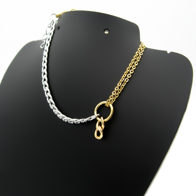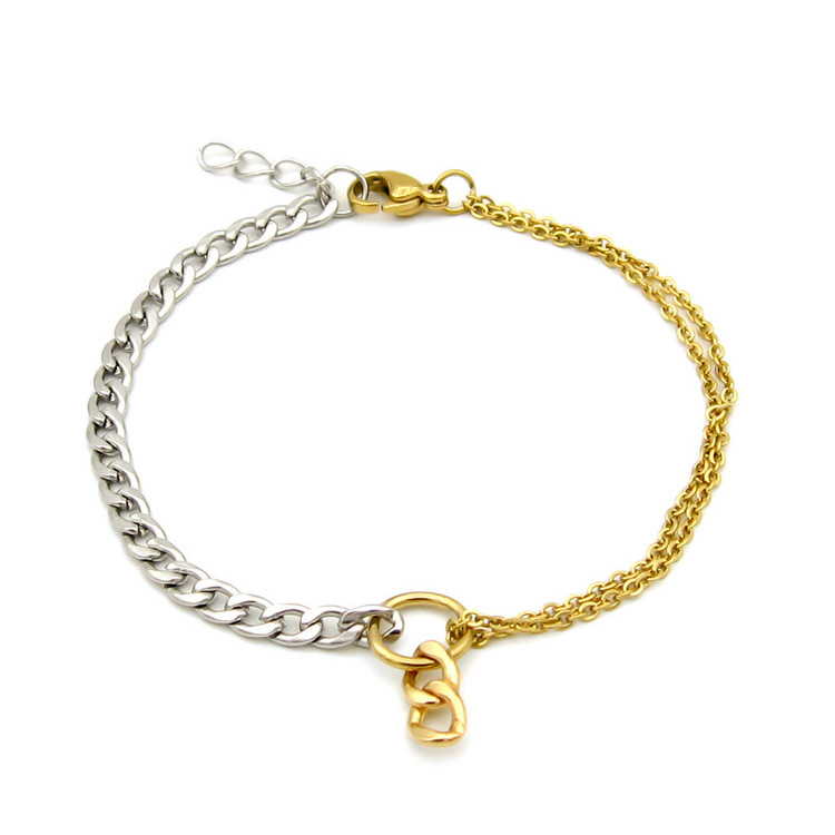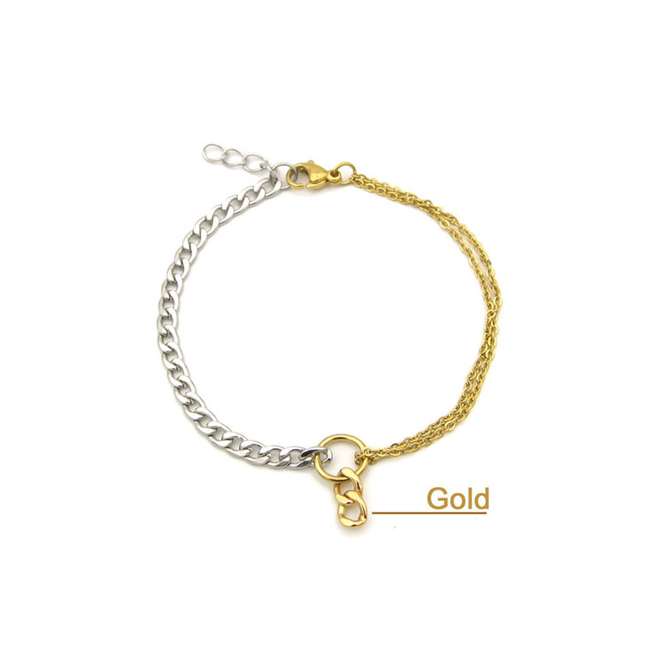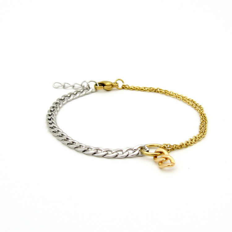 این دستبند دو رنگ دارای آویز دو حلقه زنجیر طلا 18 عیار طرح کارتیر، به همراه زنجیر های استیل طلایی و نقره ای طرح کارتیر و طول حدودی دستبند 18 سانتی متر و دارای یک سانتی متر ریگلاژ می باشد.