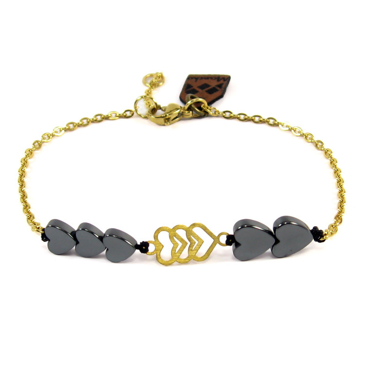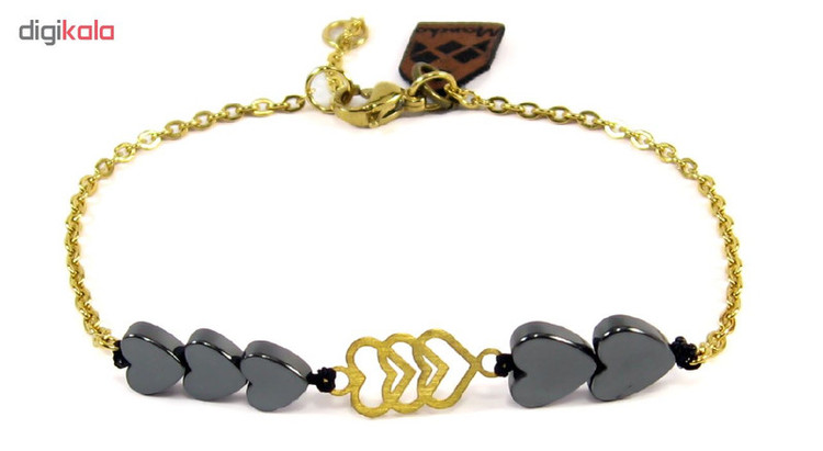 ترکیبی از سنگ های حدید نوک مدادی به شکل قلب و یک پلاک طلا 18 عیار با طرح سه قلب روی هم در مرکز